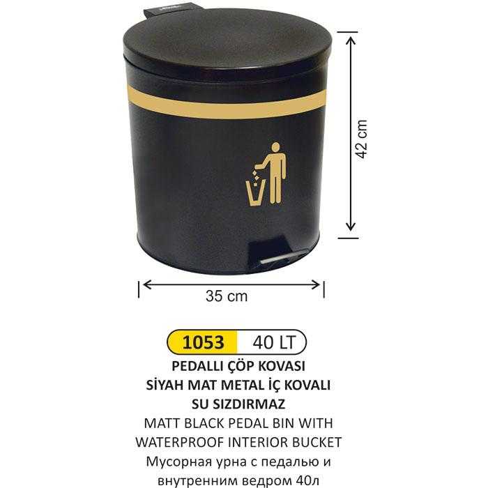 Bahçe Çöp Kovaları1053 40 LT Siyah Mat Boyalı Pedallı Çöp Kovası, elektrostatik fırın boya kaplaması sayesinde çizilmelere ve paslanmaya karşı dayanıklıdır. Su sızdırmaz metal iç kovası ve pedallı sistemiyle hem hijyenik hem de şık bir atık yönetimi çözümü sunar.