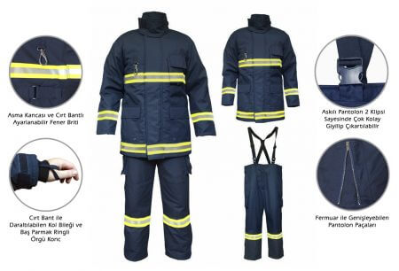 - Nefes alabilen, alev almaz, mükemmel ısı direnci sağlayan, elektrik arklarına, kimyasallara, yağa dayanıklı ve su geçirmez kapsamlı ve yüksek performanslı itfaiyeci elbisesi.